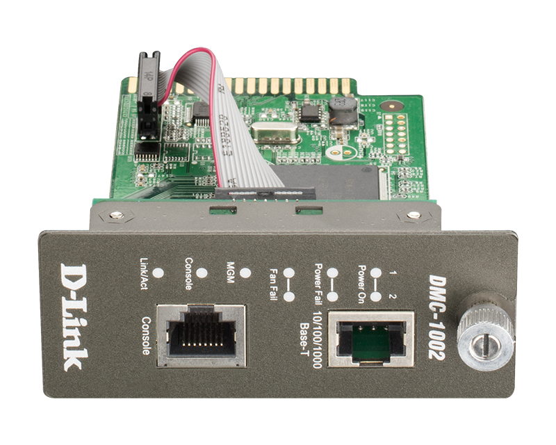 Модуль DMC-1002 позволяет сетевым администраторам осуществлять управление медиаконвертерами и блоками питания, установленными в шасси DMC-1000, посредством Web-интерфейса, интерфейса командной строки (CLI) и с помощью протокола SNMP. Порт 10/100/1000Base-T, предназначенный для выполнения сетевых подключений, позволяет пользователю осуществлять настройки и наблюдение за состоянием шасси посредством рабочей станции с поддержкой SNMP или с ПК через Web-браузер. Дополнительный порт с разъемом RJ-45 обеспечивает подключение к консоли для выполнения необходимых настроек.